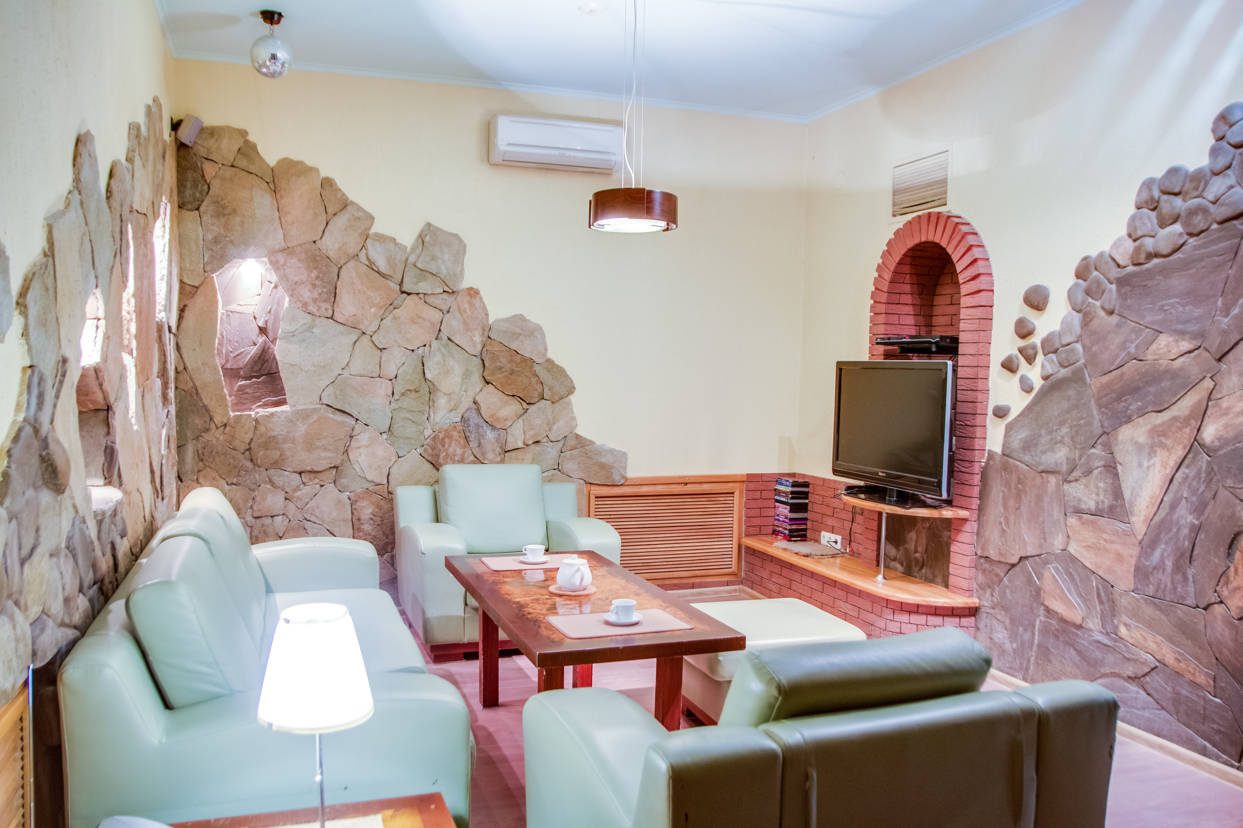 Не хочется в бассейн? Не проблема! Вместо этого можно посидеть в нашей комнате отдыха. Мы постарались создать здесь комфортный, стильный интерьер из максимально натуральных, экологичных материалов, выбрать мебель, которая будет одновременно удобной и эстетичной. Надеемся, что вы его оцените! Для создания настроения у нас есть караоке. Также у нас работает бар, где вы можете заказать блюда русской кухни, а если нужно, прийти и с собственной едой - мы не против! Только не забывайте, что плотная трапеза непосредственно перед посещением парной - это не самая хорошая идея, согласно мнению докторов. А вот после парной - совсем другое дело!